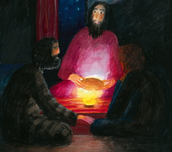 Vstoupil tedy spolu s nimi do domu a zůstal. A tu se to stalo: Když s nimi ulehl k večeři, vzal chléb, požehnal jej, rozlámal a podal jim. Náhle se jim otevřely oči a oni ho poznali. V tom okamžiku jim však zmizel z očí.